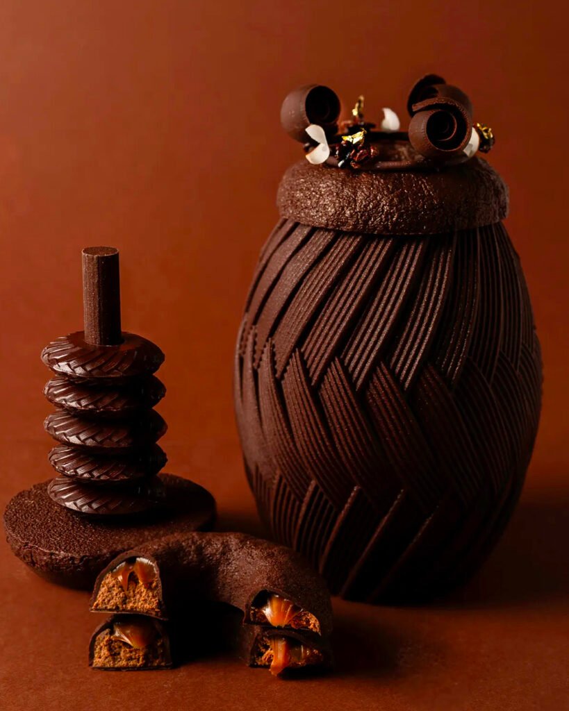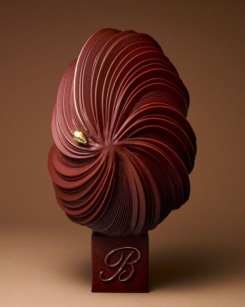 Pour Pâques 2026, le Chef Chocolatier Johan Giacchetti en collaboration avec le Chef Pâtissier Maxence Barbot, réinterprètent l’iconique Saint-Honoré à travers une sculpture de cacao saisissante. Cette création du palace parisien Le Bristol s’affranchit des codes traditionnels de l’œuf de Pâques pour célébrer le mouvement pur. Le design reproduit avec une précision chirurgicale le geste du pochage à la douille, transformant le chocolat noir en une cascade de courbes striées et aériennes qui évoquent la légèreté d’une crème Chantilly fraîchement déposée.