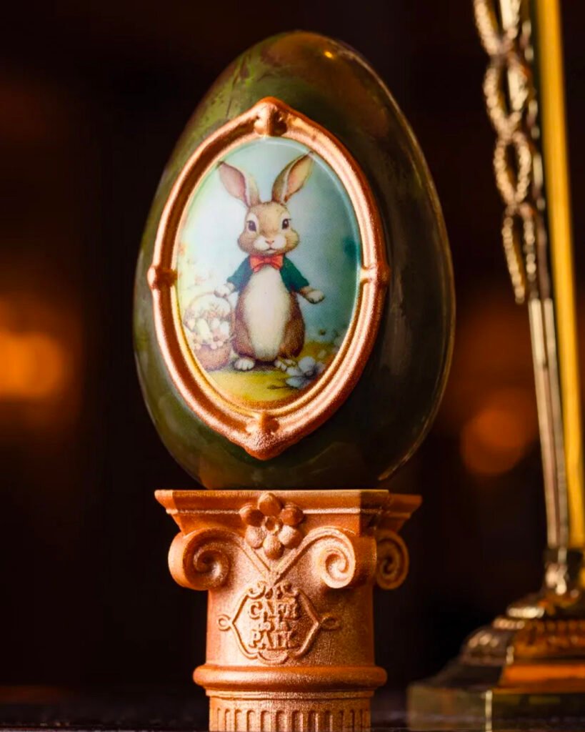 Un médaillon finement ouvragé encadre une scène d’une tendresse infinie : Un lapin de Pâques, tout droit sorti d’un conte d’autrefois, y est peint avec une délicatesse de miniature. Vêtu de son habit de fête, il incarne l’esprit de l’enfance et la magie du printemps, transformant le chocolat en une toile où la poésie se déguste autant qu’elle se contemple.