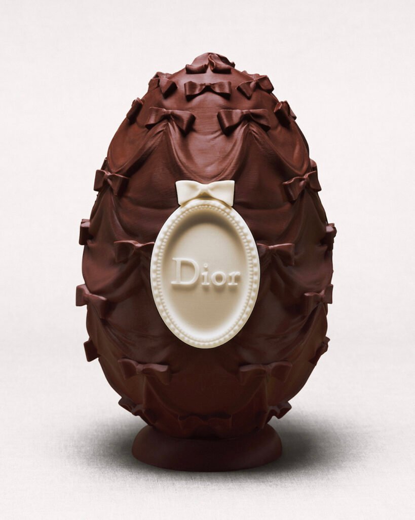 Pour cette saison de Pâques 2026, sous l’impulsion des chefs Jean Imbert et Romuald Guiot, chez Dior, l’œuf de Pâques s’habille des codes iconiques de la maison, telle une création sortie tout droit des ateliers haute couture. Sa structure en chocolat noir rend un hommage vibrant à la robe « Miss Dior » de 1949, reproduisant avec une finesse rare l’effet d’un drapé haute couture rythmé par une multitude de petits nœuds emblématiques.