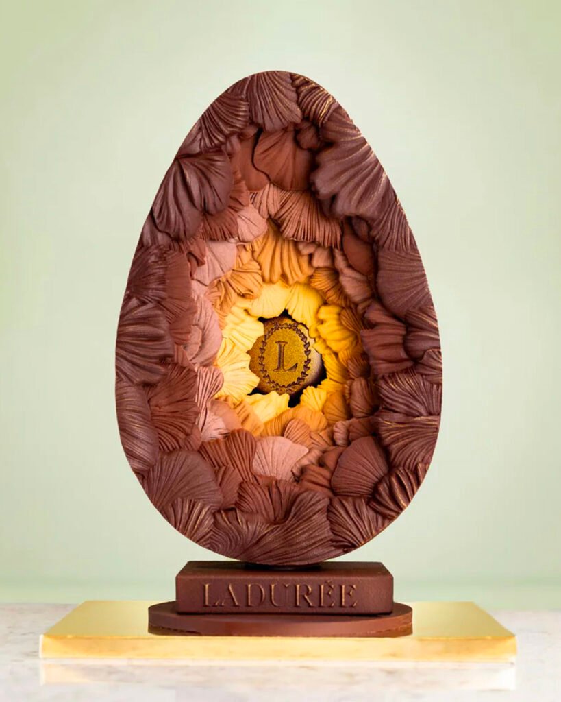Au cœur du jardin de la maison Ladurée, le chocolat se fait fleur et le temps suspend son vol pour laisser place à une éclosion de velours. Ce n’est plus un œuf que l’on contemple, mais une géode de gourmandise, où chaque pétale de cacao semble avoir été sculpté par le souffle d’un printemps éternel. Le Chef Julien Alvarez y a figé la pureté d’une éclosion, jouant avec les volumes pour offrir au regard une profondeur hypnotique.