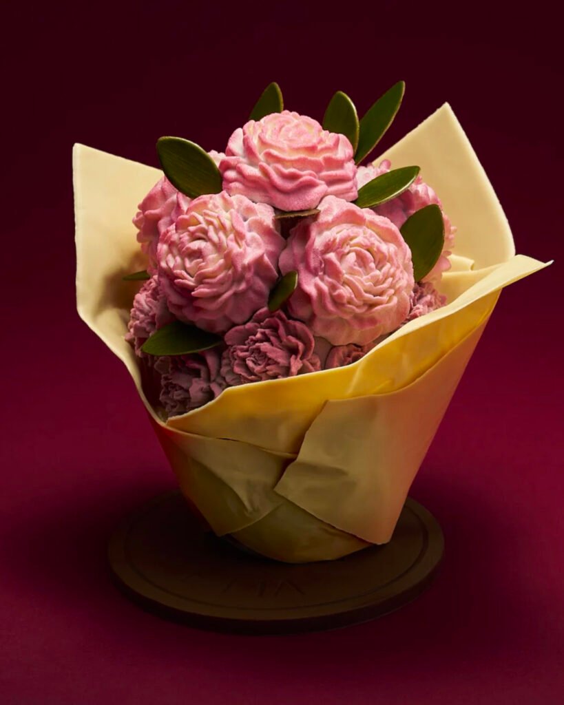Sous le pinceau de Nicolas Guercio, ce bouquet devient un jardin de secrets où chaque corolle est une promesse. On effeuille du regard des fleurs de guimauve aérienne, nuages sucrés qui s’entrelacent à la douceur d’un chocolat au lait aux accents d’enfance. Ici, une pétale de framboise s’éveille en une caresse acidulée ; là, des feuilles sculptées en chocolat blanc et Dulcey viennent parfaire cette partition végétale. Une dégustation comme une promenade immobile, où l’artisanat se fait poésie des sens.