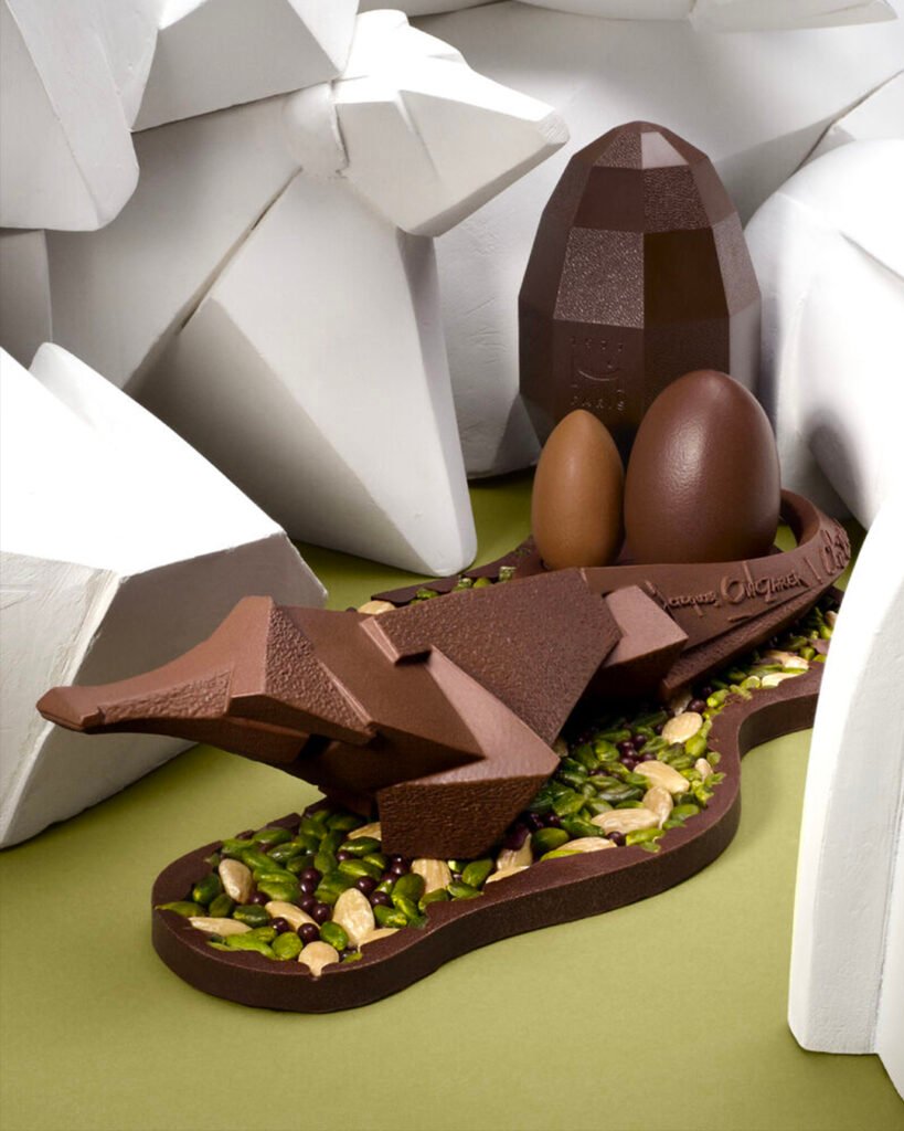 Sous le ciseau expert de Nicolas Cloiseau, la gourmandise se fait sauvage et s’incarne dans les traits de Tanakio, un crocodile de chocolat né d’une rencontre avec le sculpteur cubiste Jacques Owczarek. Cette pièce artistique, d’une envergure magistrale, délaisse la rondeur classique de Pâques pour une architecture de lignes tendues et d’angles vifs, où le noir intense capture la lumière comme un bronze précieux.