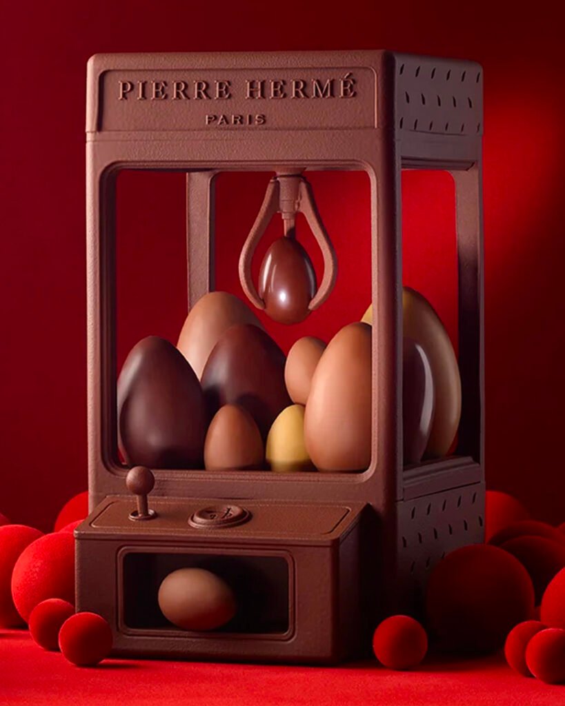 Pour la saison pascale 2026, la Maison Pierre Hermé Paris transforme la mythique machine « attrape-peluches » des fêtes foraines en une pièce d’exception monumentale. Baptisée « Pur Hasard », cette création de près de 7 kilogrammes détourne les codes ludiques de l’enfance pour les porter au sommet de la haute chocolaterie.